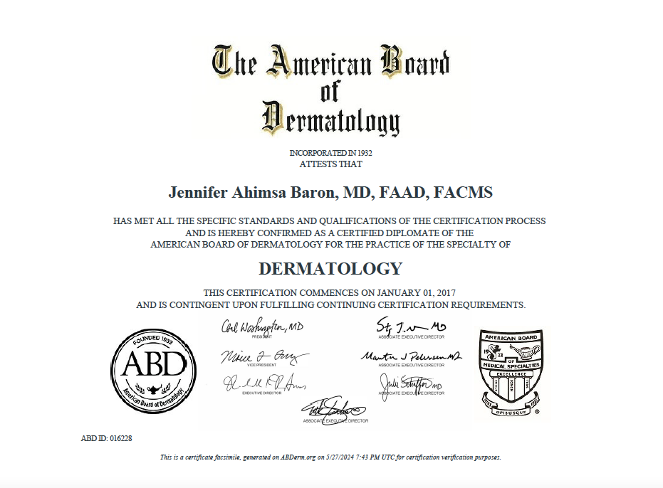 Jennifer Baron, M.D. is a peoples' choice, community-voted top dermatologist and Mohs skin cancer surgeon, skilled in advanced cosmetic and reconstructive procedures and creator of original premium skincare products. Dr. Baron and her medically-certified team are dedicated to preserving and enhancing the health of our most resilient and beautiful organ.